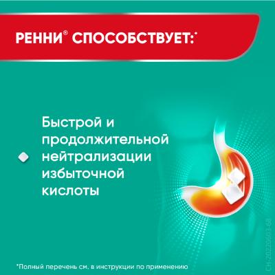 Ренні – антацидний препарат місцевої дії, що містить кальцію карбонат і магнію карбонат, які забезпечують швидку та тривалу нейтралізацію надлишкової соляної кислоти шлункового соку. Це сприяє захисту слизової оболонки шлунка від подразнення та запобігає розвитку симптомів гастроезофагальної рефлюксної хвороби.